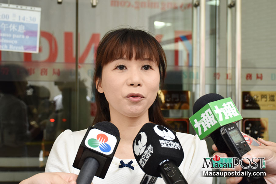Gaming Professionals Association President Cloee Chao Sao Fong speaks to reporters before a meeting with officials of the Labour Affairs Bureau (DSAL) at the bureau yesterday. – Photo: Leong Lok Ian
