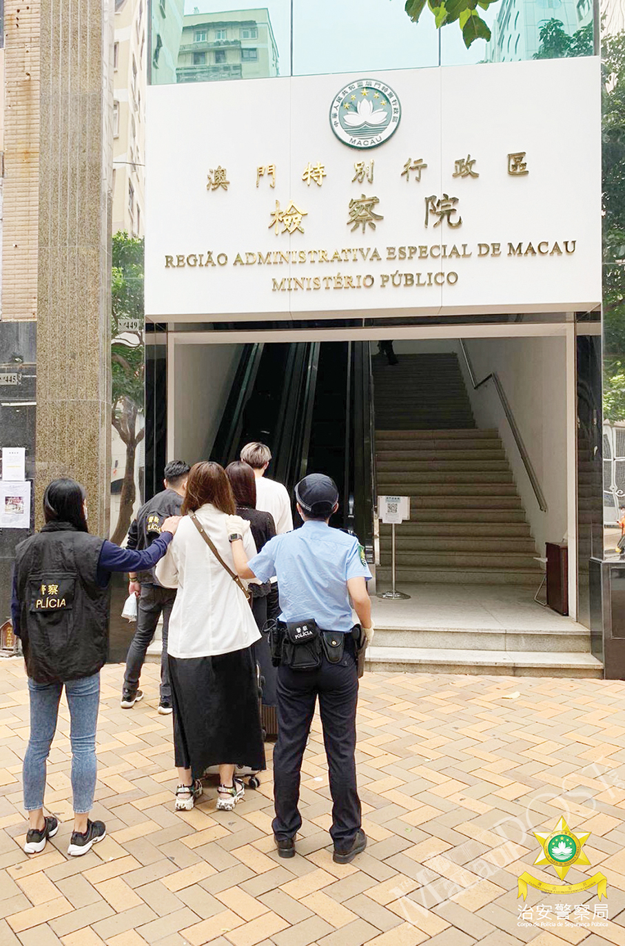 This handout photo provided by the Public Security Police (PSP) yesterday shows PSP officers escorting the three suspects to the Public Prosecutions Office (MP) yesterday.
