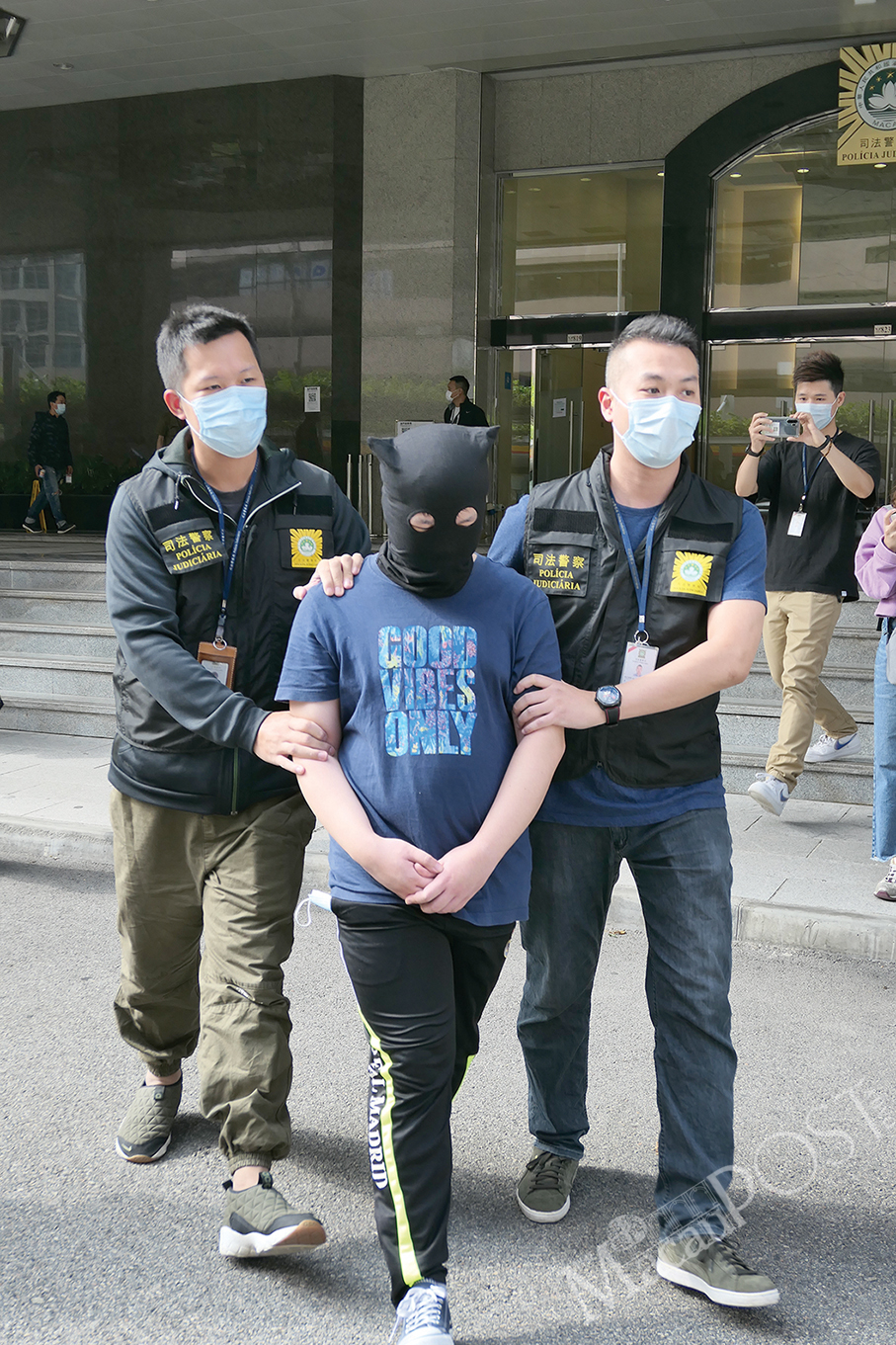 The hooded suspect is escorted by Judiciary Police (PJ) officers from the PJ headquarters in Zape to a vehicle yesterday. Photos: Iong Tat Choi