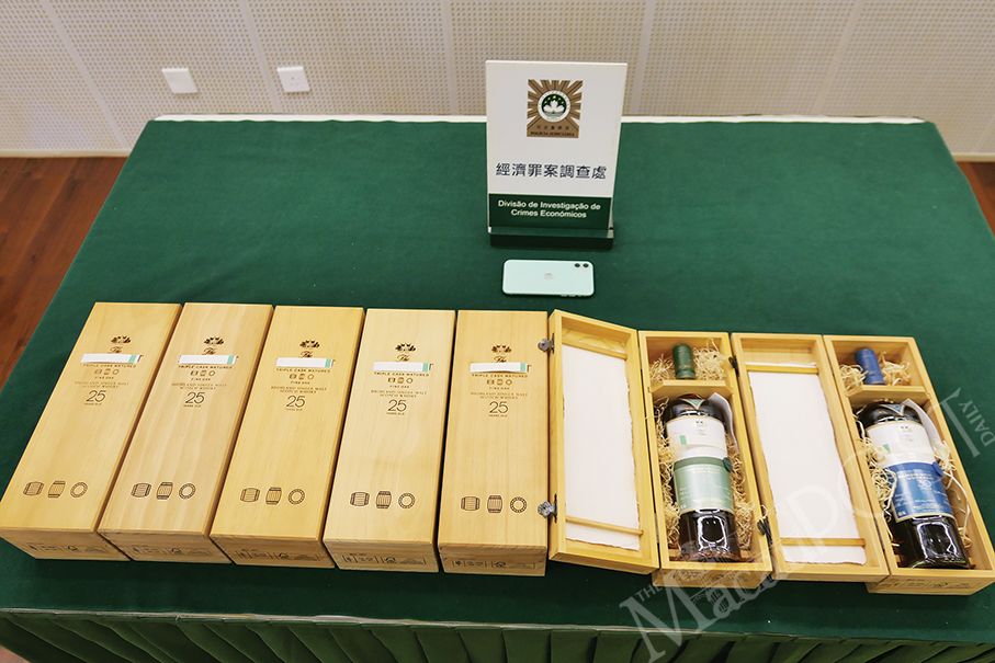 Evidence seized from the suspect such as seven bottles of Scotch whisky and a smartphone is displayed during yesterday’s special press conference about the case at the pressroom of the Judiciary Police (PJ) headquarters. Photos: Iong Tat Choi