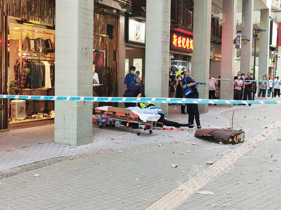 Paramedics give basic treatment to a female passer-by who was hit by an illegally set up canopy yesterday afternoon that had been fallen from the external wall of a flat of I Chan Kok in Zape. Photo: Iong Tat Choi