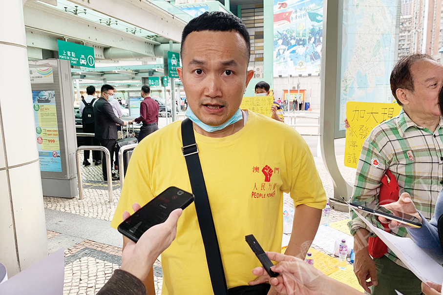 People Power Macau President Iam Weng Hong talks to reporters yesterday outside the Barrier Gate checkpoint. Photo: Prisca Tang