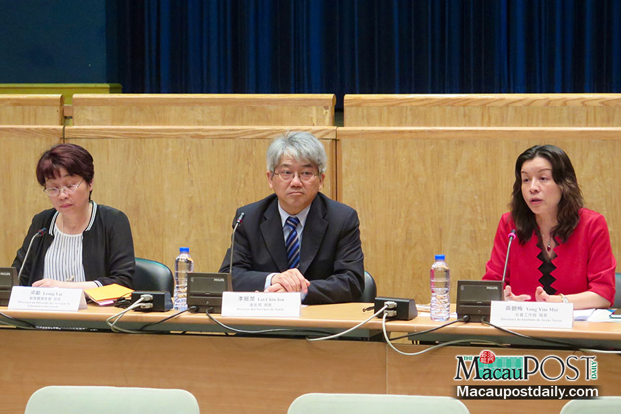 Social Welfare Bureau (IAS) President Celeste Vong Yim Mui (left) speaks during yesterday’s press conference at the public Conde de Sao Januario Hospital Centre while Health Bureau Director (SSM) Lei Chin Ion (centre) and Leong Lai, who heads the Education and Youth Affairs Bureau (DSEJ), look on. –Photo: Davis Ip