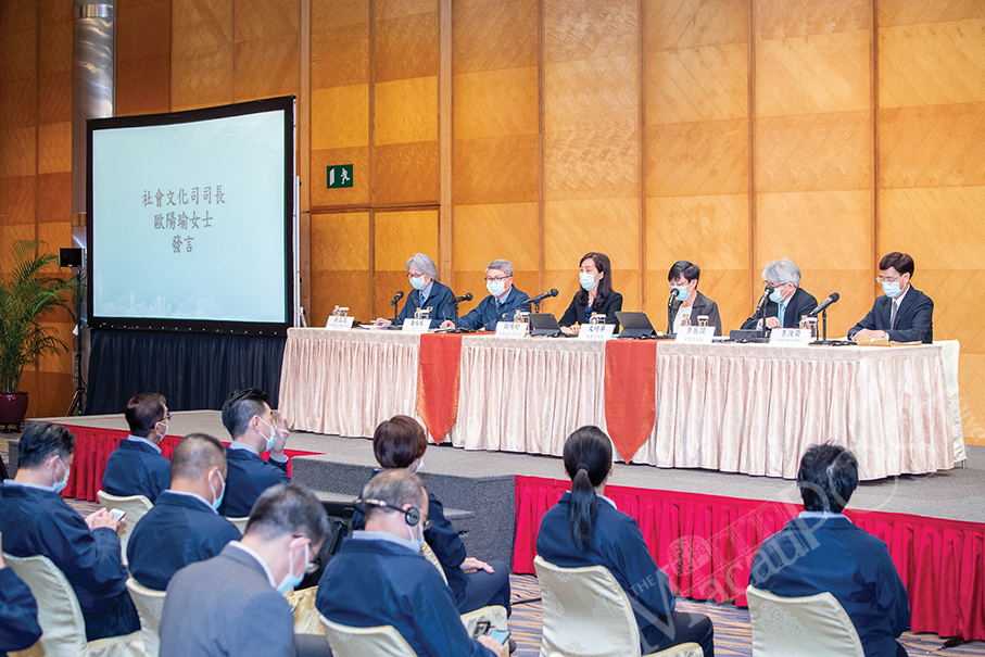 Macau Grand Prix Organising Committee Coordinator Chong Coc Veng (from left to right), Sports Bureau (ID) President and Macau Grand Prix Organising Committee Coordinator Pun Weng Kun, Secretary for Social Affairs and Culture Elsie Ao Ieong U, Macau Government Tourism Office (MGTO) Director Maria Helena de Senna Fernandes, Health Bureau (SSM) Director Lei Chin Ion, United Association of Food and Beverage Merchants of Macau Chairman Kenneth Lei U Weng give a press conference on the upcoming “Tour Macau Carnival” at Macau Tower yesterday. Photo: GCS