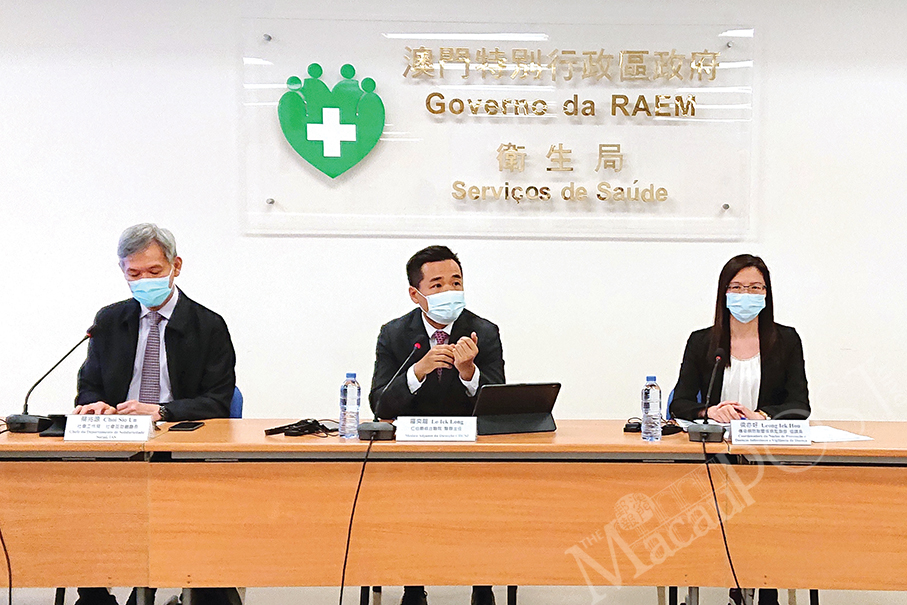 Alvis Lo Iek Long (centre), one of the three clinical directors of the public Conde de São Januário Hospital Centre, speaks during yesterday’s press conference about the city’s novel coronavirus (COVID-19) situation, as Health Bureau (SSM) Control of Communicable Diseases and Surveillance of Diseases Department Coordinator Leong Iek Hou (right) and Choi Sio Un, who heads the Social Welfare Bureau’s (IAS) Social Solidarity Department, look on. Photo: Tony Wong