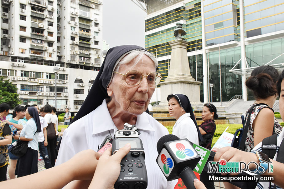 Sister Juliana Devoy, director of the Good Shepherd Centre, speaks to reporters before setting off from Vasco da Gama Garden yesterday. Photos: Leong Lok Ian