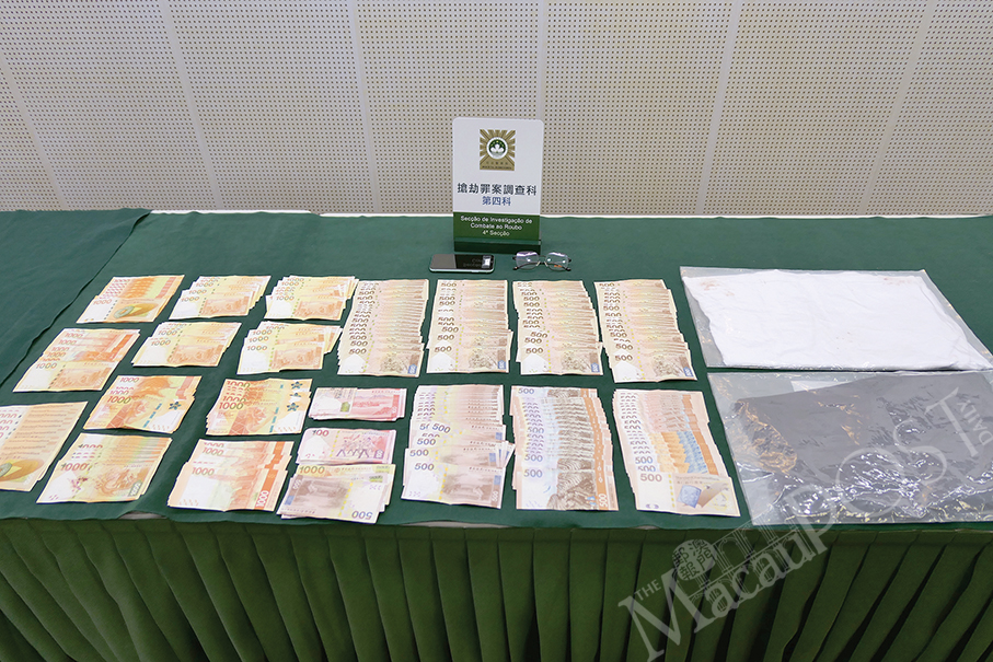 Evidence seized from the suspect such as Hong Kong dollar notes and a pair of glasses are displayed during yesterday’s special press conference at the Judiciary Police (PJ) headquarters. Photos: Iong Tat Choi