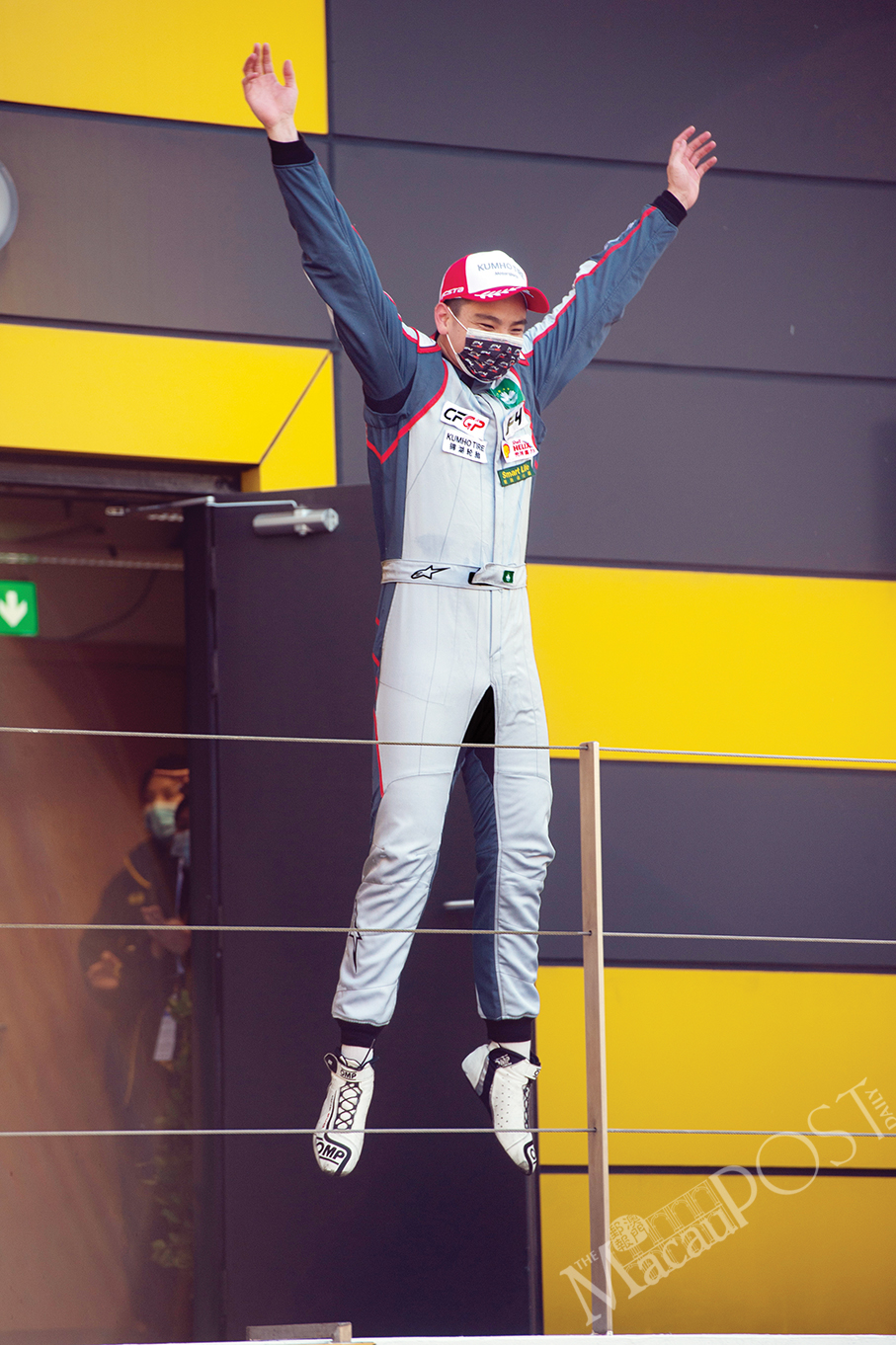 Macau driver Charles Leong Hon Chio celebrates after winning the final race of the F4 Macau Grand Prix (MGP) at the MGP complex in the Zape yesterday afternoon. – Xinhua