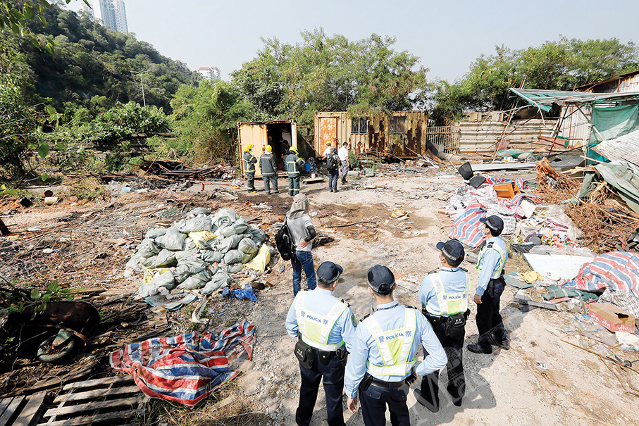 Policemen and firemen take part in the government’s operation on Tuesday to repossess a plot of land at the northern coast of Taipa initially slated for an “Ocean World” theme park project. Photos: DSSOPT