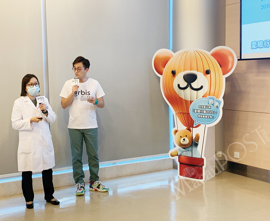 Assisted by well-known local MC José CR, Kiang Wu Hospital’s Ophthalmology Department Deputy Director Hong Sin U (left) presents the findings of a survey about locals’ lack of knowledge of glaucoma at the hospital yesterday. Photo: Prisca Tang