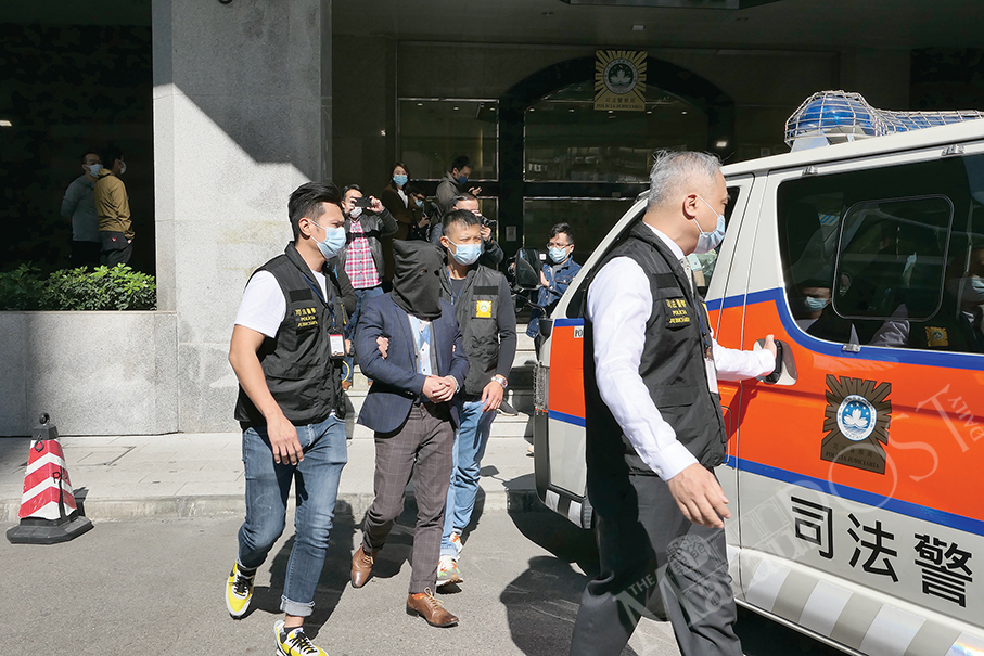 The hooded suspect is escorted by Judiciary Police (PJ) officers from the PJ headquarters in Zape to a vehicle yesterday. Photos: Iong Tat Choi
