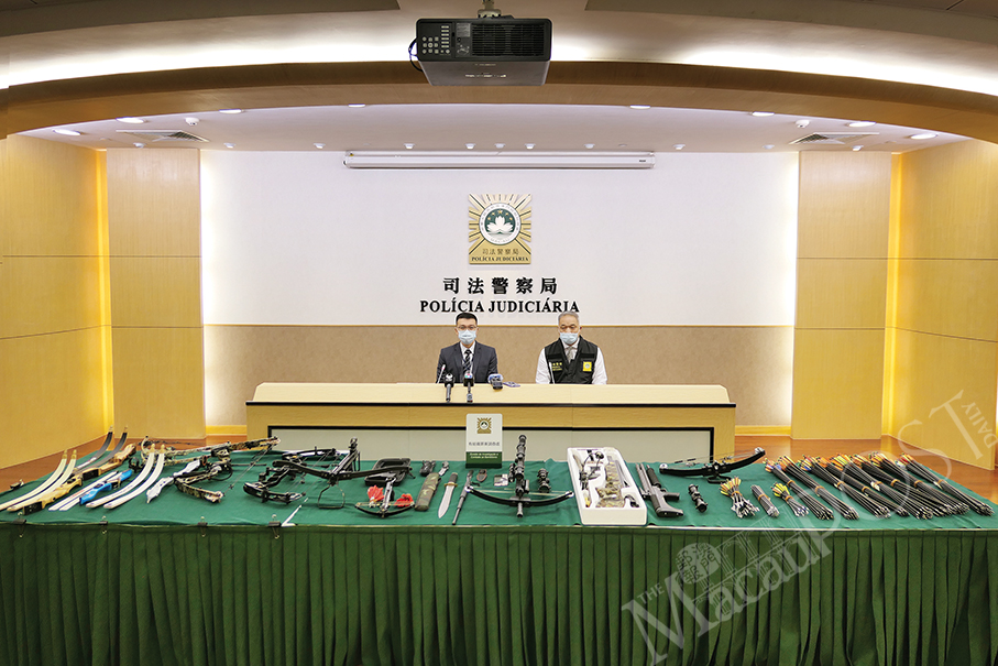 Evidence seized from the suspect such as crossbows, bows, sabers, a sword, a stun gun, a telescopic baton, and a number of arrows are displayed during yesterday’s special press conference hosted by Judiciary Police (PJ) spokesman Choi Ian Fai and a PJ officer at the PJ headquarters.