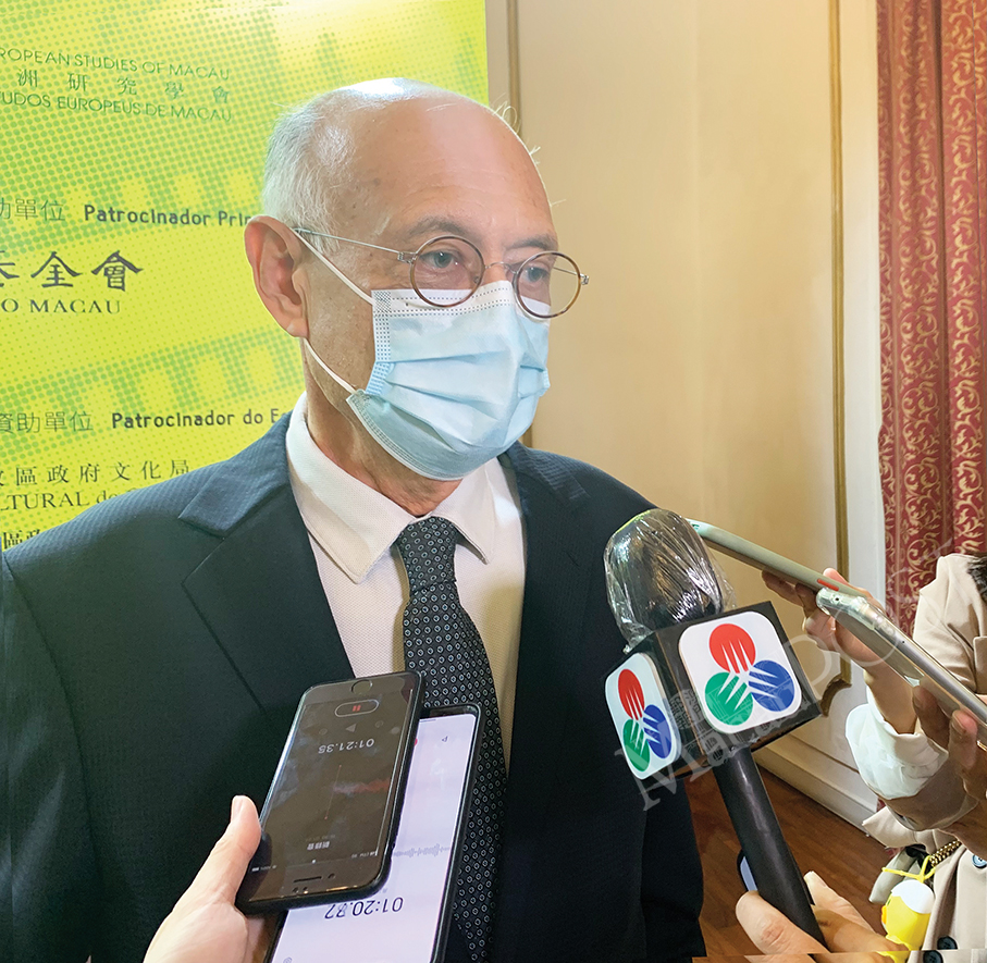 The president of the 11th Macau International Short Film Festival, José Luís de Sales Marques, talks to reporter on the sidelines of the film-fest’s opening ceremony at the Dom Pedro V Theatre yesterday. Photo: Prisca Tang
