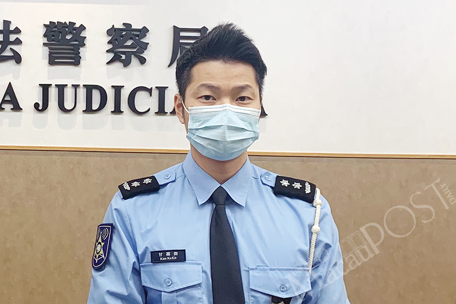 Public Security Police (PSP) spokesman Kam Ka Kit poses during yesterday’s regular press conference.