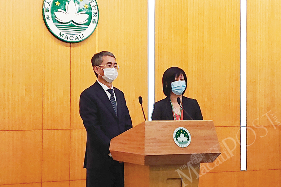 Lands, Public Works and Transport Bureau (DSSOPT) Director Chan Pou Ha (right) speaks during yesterday’s press conference at Government Headquarters about the government’s Urban Construction Legal System bill, as Secretary for Administration and Justice André Cheong Weng Chon, also the spokesman for the government’s top advisory Executive Council, looks on.