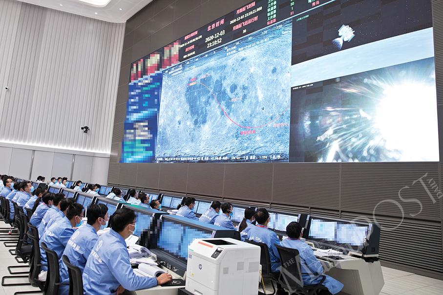 Scientific and technological personnel work at the Beijing Aerospace Control Center (BACC) in Beijing yesterday. China’s Chang’e-5 spacecraft carrying the country’s first lunar samples blasted off from the moon last night, the China National Space Administration (CNSA) announced. This represented the first-ever Chinese spacecraft to take off from an extraterrestrial body.