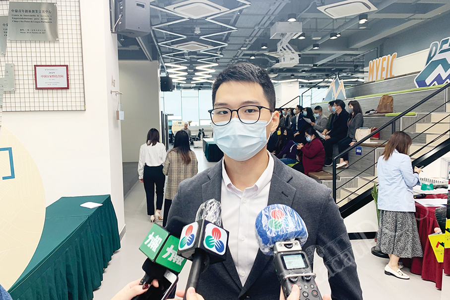 Chinese Youth Advancement Association Secretary-General Marty Si Iat talks to the media on the sidelines of yesterday’s Nansha one-stop service for young entrepreneurs platform launch ceremony at the Macau Young Entrepreneur Incubation Centre in Nape.