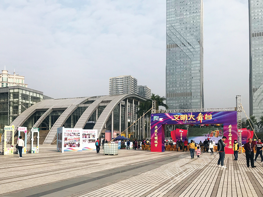 Pedestrians flock to an open-air public awareness campaign event in Jiangmen to promote joint efforts for the setting-up of a civilised city so that all citizens can enjoy quality of life together.