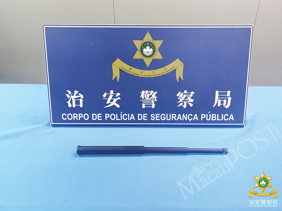 This undated handout photo provided by the Public Security Police (PSP) yesterday shows a metal telescopic stick seized by the police from a Taiwanese traveller at the local airport on Sunday.