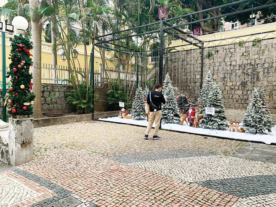 A man takes photos of Christmas decorations in the courtyard of the Albergue SCM art space in St. Lazarus District.