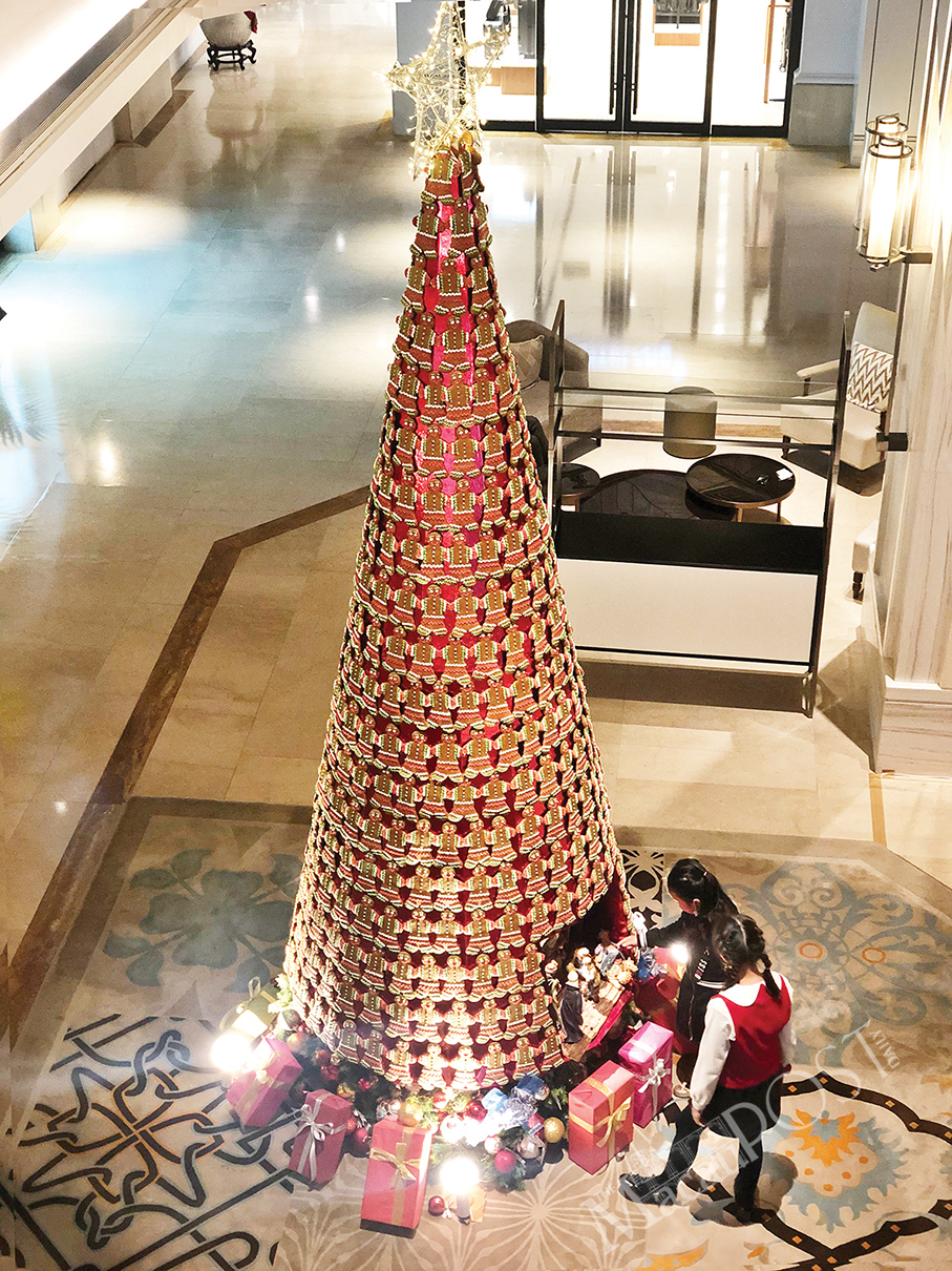 Children look at a Christmas tree made of gingerbread men biscuits at the Artyzen Grand Lapa Macau hotel.