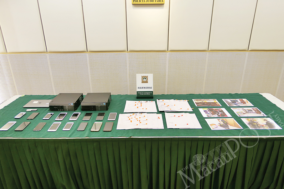 Evidence seized from the local suspects such as computers, documents and smartphones are displayed during yesterday’s special press conference at the Judiciary Police (PJ) headquarters.